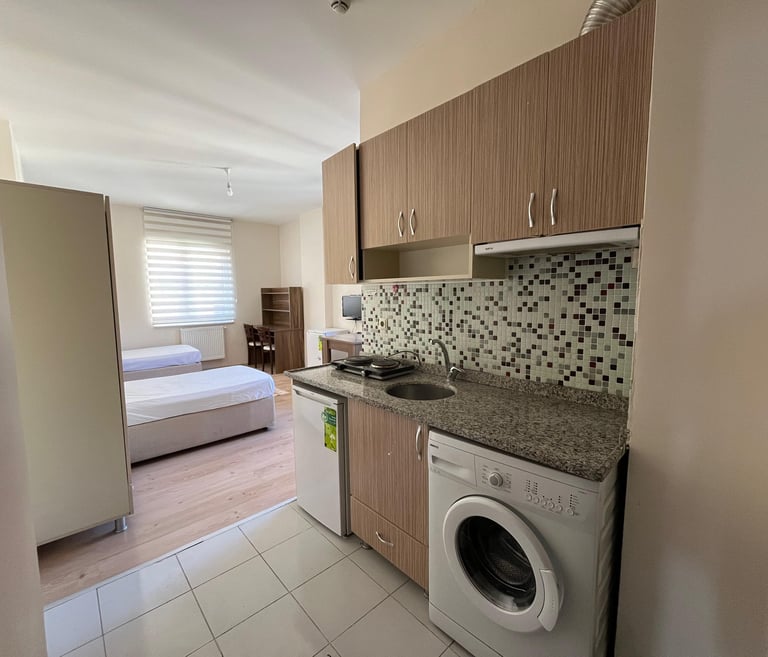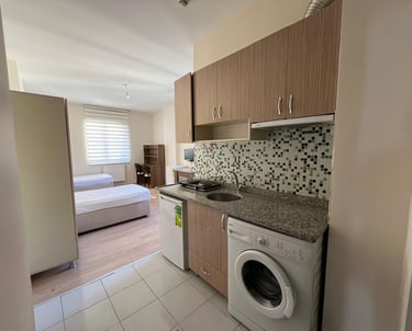 Her oda da ayrı ayrı mutfak, set üstü ocak, buzdolabı, çamaşır makinası, TV ile donatılmıştır.